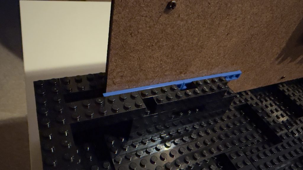 In order to do this, I used some stud-not-on-top (SNOT) brick. Then this allowed me to connect tiles to provide a sort of wall to hold the panel in place from the back.
