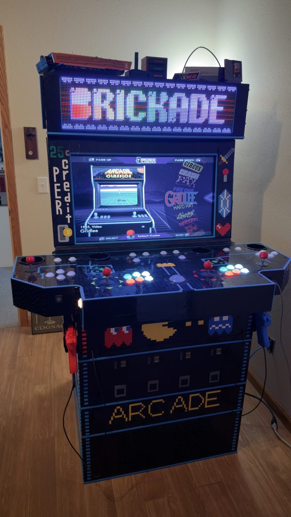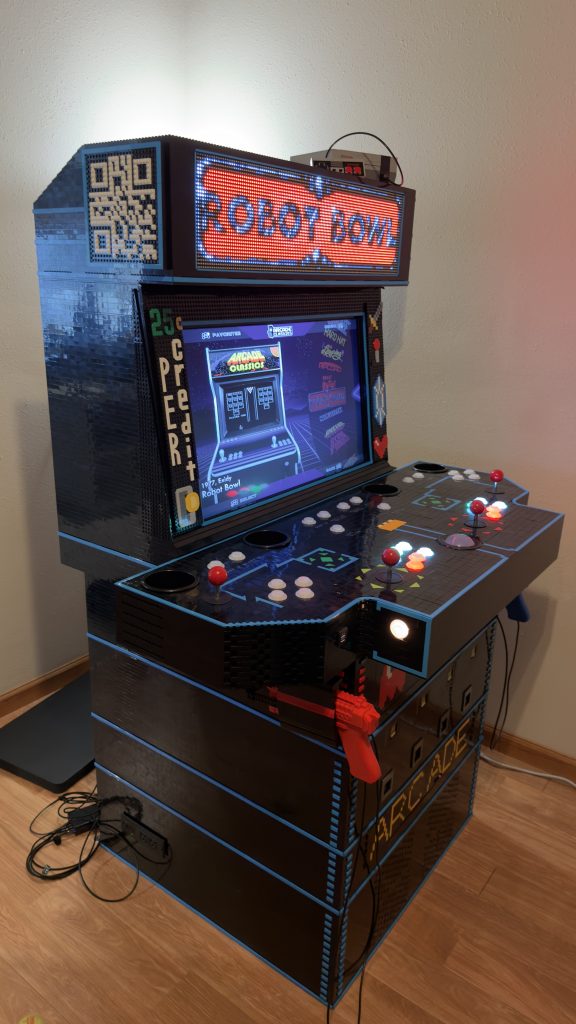 And now, I’d like to present to you all the finished arcade cabinet built entirely from LEGO® brick with the marquee now added.
