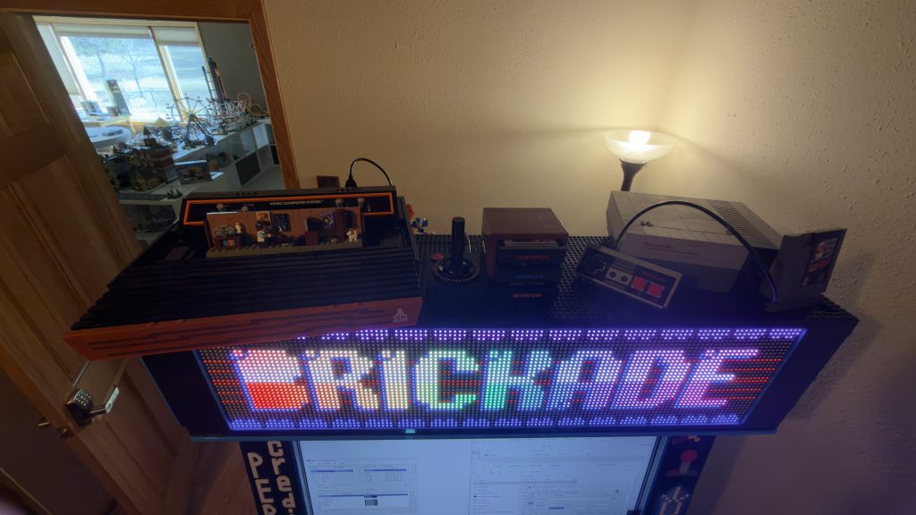 While it’s not actual 8-bit artwork on the sides, my wife created a QR code out of brick for me to affix to the side of the marquee. This QR code, when scanned, will take you to this very website https://thebrickade.com/.